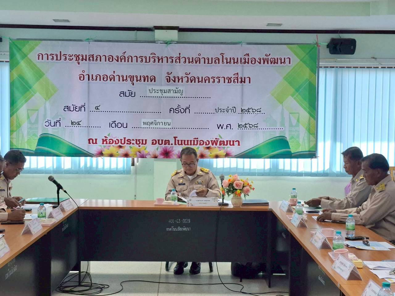 ประชุมสภาองค์การบริหารส่วนตำบลโนนเมืองพัฒนา สมัยประชุมสามัญ สมัยที่ 4 ประจำปี พ.ศ.2568  วันที่ 24 พฤศจิกายน 2568 เวลา 09.00 น. ณ ห่้องประชุมชั้น 2 องค์การบริหารส่วนตำบลโนนเมืองพัฒนา อำเภอด่านขุนทด จังหวัดนครราชสีมา